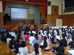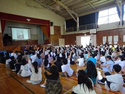 今日は、全校児童が体育館に集まって、開港記念集会を行いました。