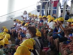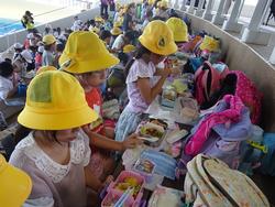 ショーの後のお弁当も、海風の吹く涼しいイルカスタジアムで、班のメンバーと一緒に美味しく食べました。