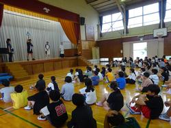 6月にもかかわらず真夏のような暑い日が多くなっています。今月からはいよいよ子どもたちが楽しみにしている水泳学習を開始します。今日はそのスタートとなる「プール開き集会」が体育館で行われました。