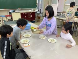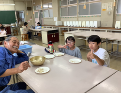 できたポップコーンを鍋から取り出して塩やカレーパウダーをかけて食べました。また、畑活動を手伝ってくださった用務員さんに子どもたちが声をかけて一緒に楽しく食べることができました。