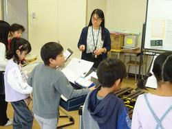 5校時、2年1組音楽では、主題名「音を合わせて演奏しよう」を取り上げ、曲「汽車は走る」を通して、「思い浮かべた様子に合うように反復や速度を工夫して、音や声を合わせて演奏する」を本時目標とした授業を実践しました。