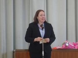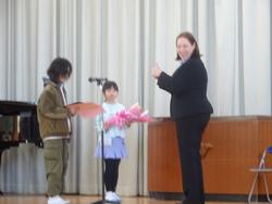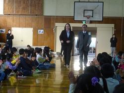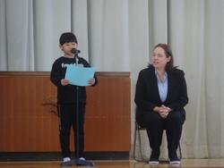 代表児童からスペイン語でのお礼の言葉を贈られ、とても喜んでくれたマリアナ先生。一年間の楽しかった思い出を全校児童で振り返りました。
