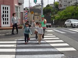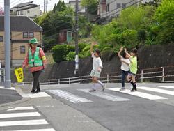 実際の横断歩道を歩きながら、青信号になったら、右・左・右をしっかりと確認し、右手を挙げて渡るなど、安全な歩行の仕方を教わました。