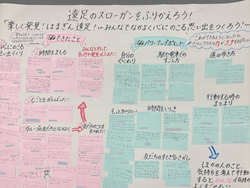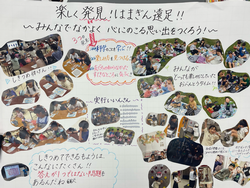 事前に実行委員を中心にクラス全員でどんな遠足にしたいかを話し合い、「科学のことを知る」「楽しみ方を見つける」「友だちのすてきポイントを見つける」の3つの「発見」の意味を込めて『楽しく発見 はまぎん遠足!~みんなでなかよく心に残る思い出をつくろう~』というスローガンに決めました。