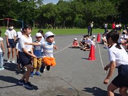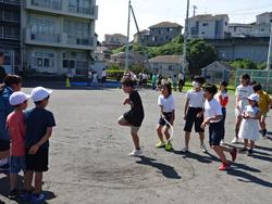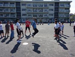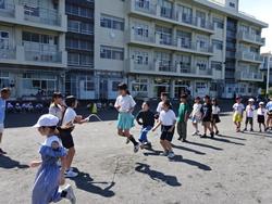 梅雨空から一転、夏空の朝を迎え、「なかよし大縄集会」が校庭で行われました。