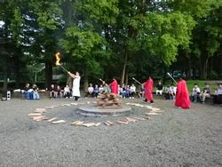 日が落ちる頃にはキャンプファイヤーもしました。火の神様が登場して火が点いてから歌やダンス、ゲームなどを行いとても盛り上がりました。