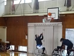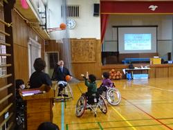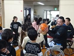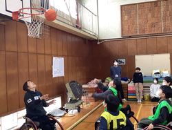 選手の皆さんからお話をうかがった後には、1~3年生の代表の児童が実際に競技用車いすに乗って、シュートを体験!!競技用の車いすは軽くてターンもスムーズなので、低学年の子どもたちも車いすを上手に操作し、くるくると上手に回ることができました。