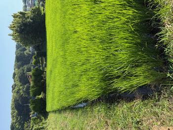 全校児童で田植えをした田んぼです。夏の日差しの中、すくすくと育っています。あと半月もすれば、稲の花が見られることでしょう。