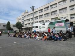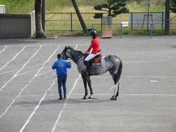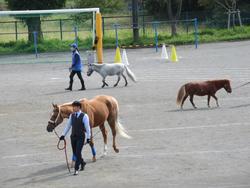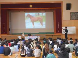 まず、体育館でJRAの方から、馬の体のつくりなどに関するお話を体育館で聞きました。馬の目は350度の視野がある、馬は足の中指一本で立っている、ニンジンが好きな馬ばかりではない、など児童たちは興味深く聞き入り、「えーっ」「そうなの」など素直な感想を述べていました。