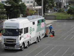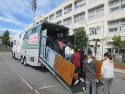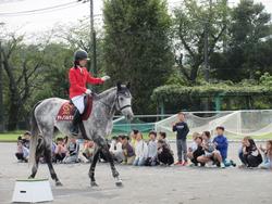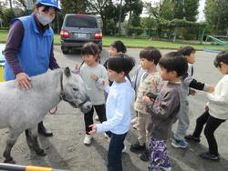 馬を運ぶ大きな「馬運車」が校庭に入り、サラブレッドとポニー合わせて4頭の馬が降り立ちました。ポニーたちは、芝生や草の上でとてもリラックスしていたそうです。騎手の方が騎乗して走る様子、馬が小さな台の上に4本足で立つ様子を見せていただき、各学年ごとに実際に馬に触れさせていただく機会を持ちました。初めて見る馬運車の中に入ったり、日ごろ馬が食べている餌を見学したりと、とても貴重な時間を過ごした鉄小の児童たちでした。