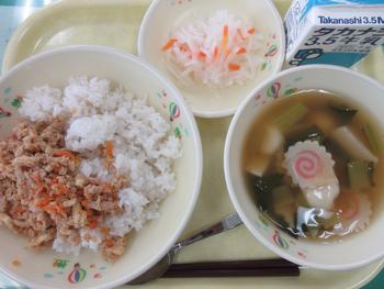 1月13日の給食メニューは、むぎごはん、ツナそぼろ、白玉雑煮、なます、牛乳です。毎年、1月に登場する、お正月メニューです。お餅ではなく、白玉のお団子が入ったお雑煮を給食で食べます。