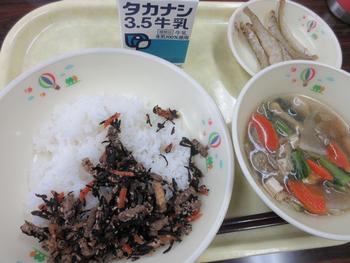 1月15日の給食メニューは、ごはん、ひじきご飯の具、さかなのからあげ、けんちん汁、牛乳です。ごはんは、5年生が中心となり、鉄小児童全員が田植えをし、稲刈りをした「はるみ」です。この日の給食で、鉄小の「はるみ」は最後になります。今年の収穫は301kg。みんなでおいしくいただきました。