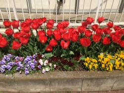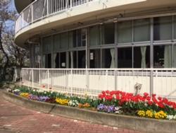 円形校舎前の花壇にあざやかに咲いているチューリップも