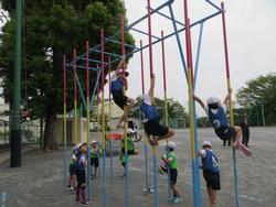 2年生は登り棒やジャングルジムを使った遊具遊びとしっぽとり鬼。思いきり体を動かしています。