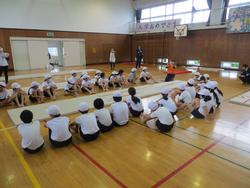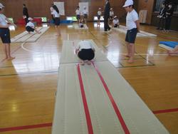 5年生はマット運動。友達同士で見合いながら、自分の技を高めたり、技を組み合わせたりしていきます。