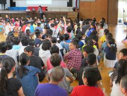 まず「開校記念式」。蒔田小学校は今年65周年です。最初に校長先生から、蒔田小学校の成り立ちについてお話がありました。円形校舎が創立時にはなかったこと、旧校舎は今の校庭の位置にあったこと(つまり現・新校舎の位置が校庭だった)などに、子どもたちは驚きの声をあげていました。