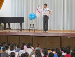 元気な顔の子どもたち。校長先生からは、スパイクや当時のユニフォーム(実物)の紹介も。