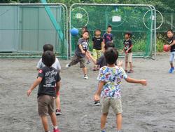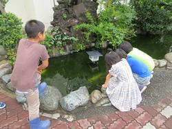 久しぶり、校長先生(鯉の名前です)!校庭ではドッジボールやドロケイで楽しむ子どもたち。