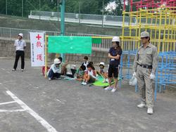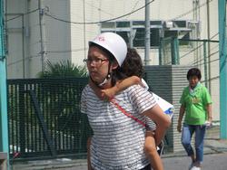 避難してきた児童の安全を確認。けがをした設定の子は、背負って避難も。