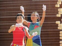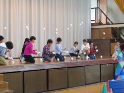 「ストリングラフィ」とは、作曲家・水嶋一江さんが考案したオリジナル楽器です。体育館に張り巡らされた「絹糸」とそれに取り付けられた「紙コップ」から発せられる音、そして全身を使った演奏方法は、子どもたちを驚かせていました。