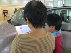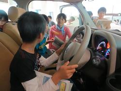 タッチパネルで説明を見る子どもたち。実際に運転席に乗れる車も!