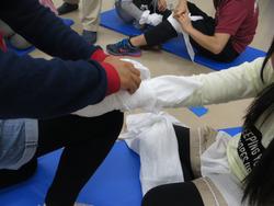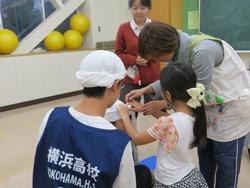 包帯の結び方、簡単な手当の仕方を、横浜高校の生徒さんが優しく教えてくれました。