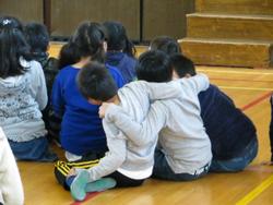 自然発生的に肩を組んで体を揺らす子どもたち。
