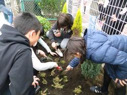風は冷たいけど、一生懸命な5年生!きれいな花が咲くといいな・・・
