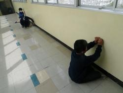 図工室の掃除をする4年生と、渡り廊下の掃除をする5年生。真剣です。