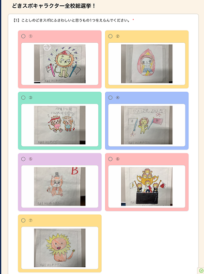 分散登校が終わり、本格的に今年のどきどきスポーツフェスティバルに向けての取り組みが始まりました。今年度のマスコットキャラクターを選ぶため、ロイロノートのアンケート機能を使い、全校で総選挙が行われました。