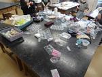 透明パックなど版に使えそうなものが机の上にたくさんあります。