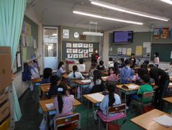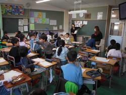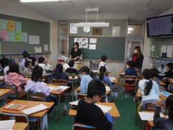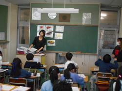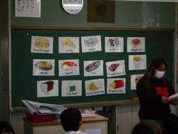 ちょうど2時間目で、英語の授業をおこなっていました。「たべもの」をテーマに、みんなでゲームをしていました。