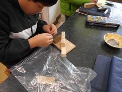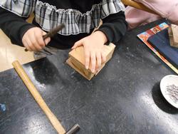 まずは円形校舎にある図工室をのぞいてみました。図工室近づくにつれて「トントン!」と聞こえてきました。3年生が金づちとくぎで、作品を作っていました。