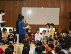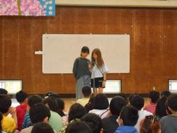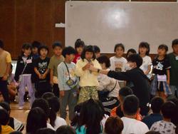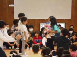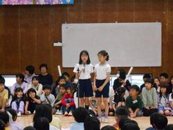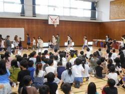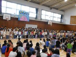 あいにく天気で体育館で「一年生を迎える会」をおこないました。6年生に手を引かれて、少し緊張しているような1年生。その後全校で、「猛獣狩りゲーム」をおこないました。閉会式では、2年生から、折り紙に包まれた「あさがおの種」が1年生にプレゼントされました。また、6年生からは、蒔田小学校の校歌の書かれた大きな紙がプレゼントされました。