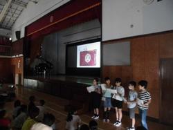 横浜港は1859年から数えると、今年で165歳。蒔田小学校は今年で、73歳となります。はじめに、蒔田小学校の歴史を4年生が紹介してくれました。その後、先生から横浜港の歴史について解説をしてもらいました。最後はみんなで蒔田小学校の校歌と横浜市歌を歌ってお祝いをしました。