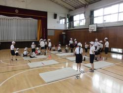 ソフトボール投げや反復横跳び、長座体前屈や上体そらしなど「体力テスト」に取り組みました。2年生と5年生のペアで班になって、
