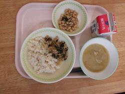 今日のメニューは、牛乳・ぶどうまめ・さつま汁・ぶたどんの具・はいがごはんです。