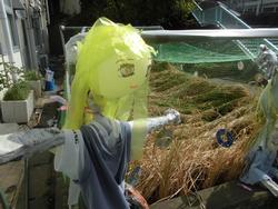 職員室の外にある田んぼを見てみると、5年生たちのお手製「かかし」ができていました。