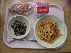 牛乳・ひじきサラダ・チーズ・ぶどうパン・スパゲティトマトソースです。「スパゲティ」は子ども達に大人気の一つです。