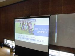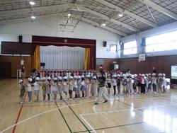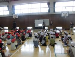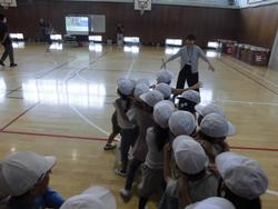 あいさつを練習してから、「鷹とにわとり」という中国の遊びを体験しました。1組と2組に分かれて、肩を組みながら、「鷹」から逃げます。子ども達の中には、一人「にわとり」がいて、子ども達を守ります。おにごっこのようなゲームでしたね。みんな楽しく取り組みました。最後は講師の先生に「謝謝(シェイシェイ)!」と元気に挨拶をしました。