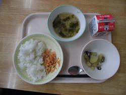 牛乳・秋味ごはんの具・さつまいもとくりの甘煮・みそしる です。「秋味ごはん」ということで、鮭のフレークときのこがはいったご飯です。