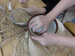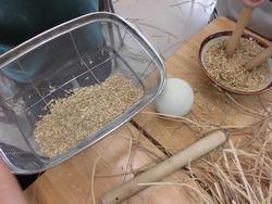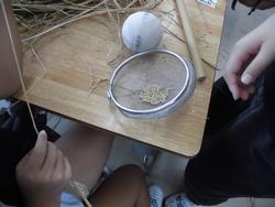 ざるに、「もみ」の状態のお米を入れて、「もみすり」をしました。ソフトボールや棒と使って一生懸命こすります。