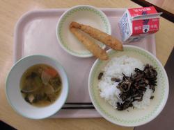 今日のメニューは、ししゃもフライ、ひじきごはん、のっぺい汁、牛乳です。