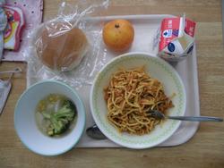 今日のメニューは、かぶのスープに、スパゲティミートソース、チーズパン、牛乳、みかんです。