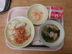 さけそぼろと麦ごはん、なます、しらたまぞうに、牛乳 です。新春らしい色合いと体の温まる雑煮の給食です。