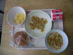 ヌードルスープ、ツナのカレー炒め、ミックスフルーツ、まるパン、牛乳です。子ども達は、パンとツナカレーを合わせながら、おいしく給食を食べていました。今日も完食です!