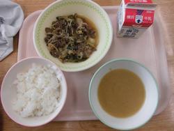 牛乳、すき焼き風煮、ごはん、みそしる です。甘じょっぱい「すき焼き風煮」と