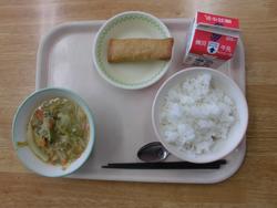 今日のメニューは、ごはん、タンタンスープ、はるまき、牛乳です。給食で「タンタンスープ・はるまき」が出ることはめずらしいです。