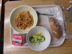 今日のメニューは、スパゲティーミートソースとぶどうパン、サラダ、牛乳です。「給食ひさしぶりだあ!」と子どもたちは大喜び。
