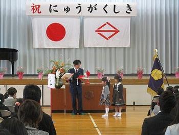 交通安全協会から、新入生代表がランドセルカバーを受け取ります。